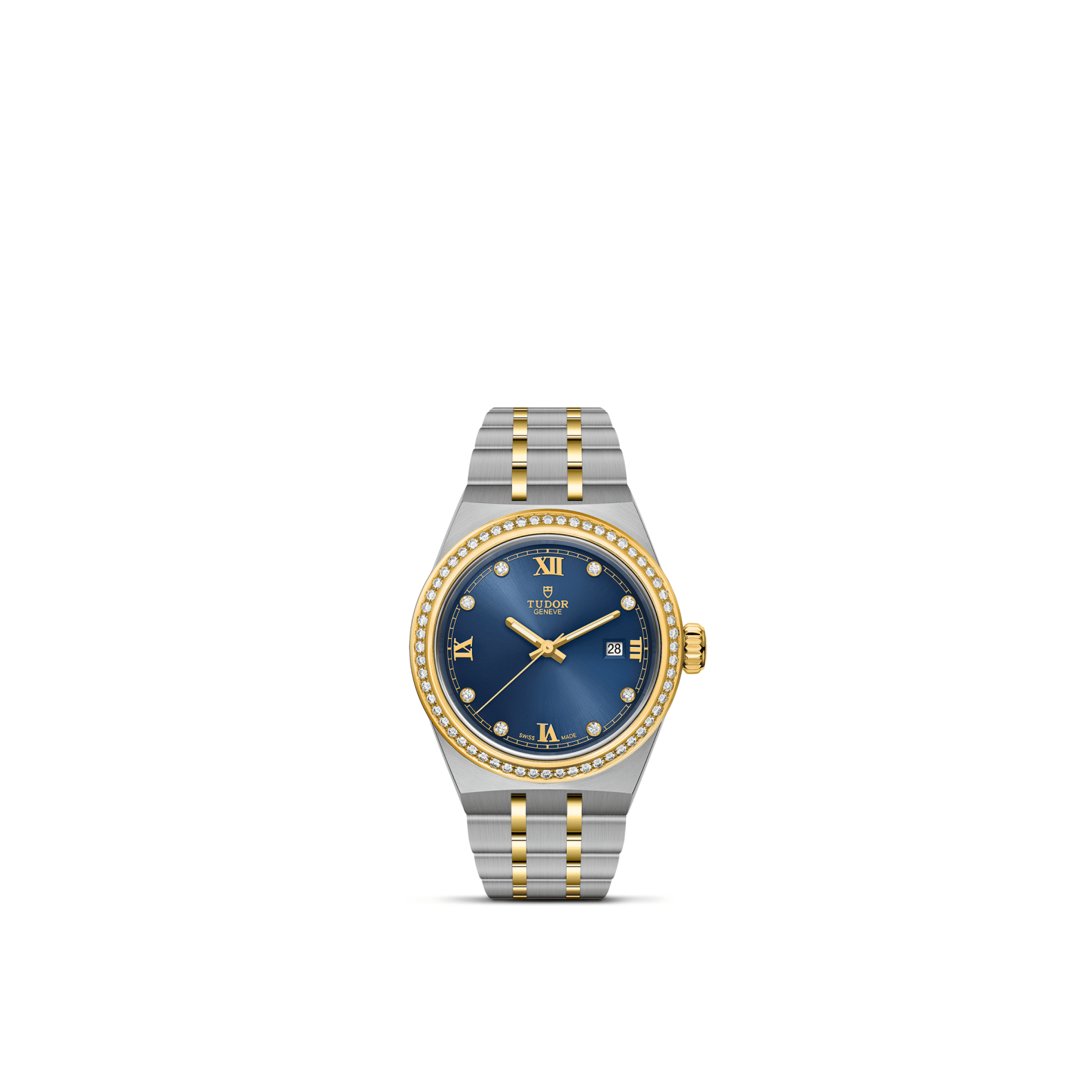 La Tudor Royal en acier de 28 mm se distingue par un cadran bleu intense rehaussé de chiffres romains et par une lunette en or jaune sertie de 60 diamants. Conçue en partenariat avec l’acteur Cheng Yi, elle exprime à la fois l’audace contemporaine et le raffinement horloger. Son bracelet alternant acier et or jaune souligne son élégance, tandis que le calibre automatique T201 assure précision et fiabilité pour une allure résolument sophistiquée.