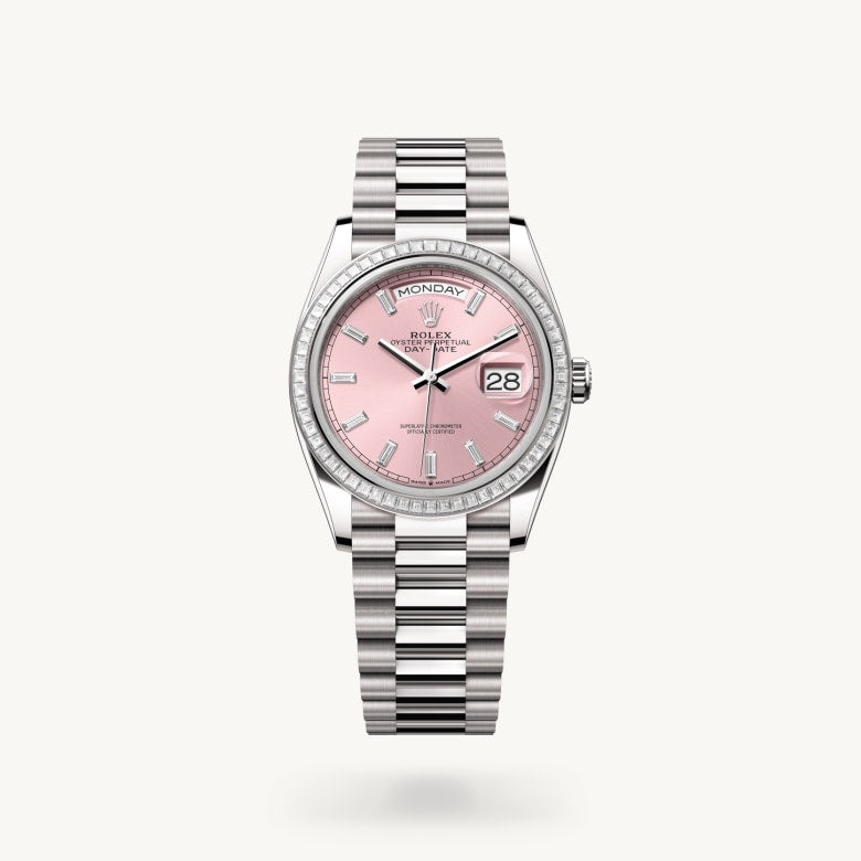 Ce cadran est doté de 10 diamants taille baguette. La finition soleil permet d’obtenir des reflets ondoyants sur de nombreux cadrans de la collection Oyster Perpetual. Créée par un brossage circulaire continu parfaitement maîtrisé, elle présente des stries allant du centre du cadran vers l’extérieur. En se reflétant de manière à la fois régulière et aléatoire sur ces gravures, la lumière produit un chatoiement délicat et des reflets subtils caractéristiques de cette technique. Une fois la finition soleil réalisée, le cadran est coloré par un traitement PVD (Physical Vapour Deposition, dépôt physique en phase vapeur) ou par un procédé de galvanoplastie. Une infime couche de vernis lui confère ensuite son rendu final.
