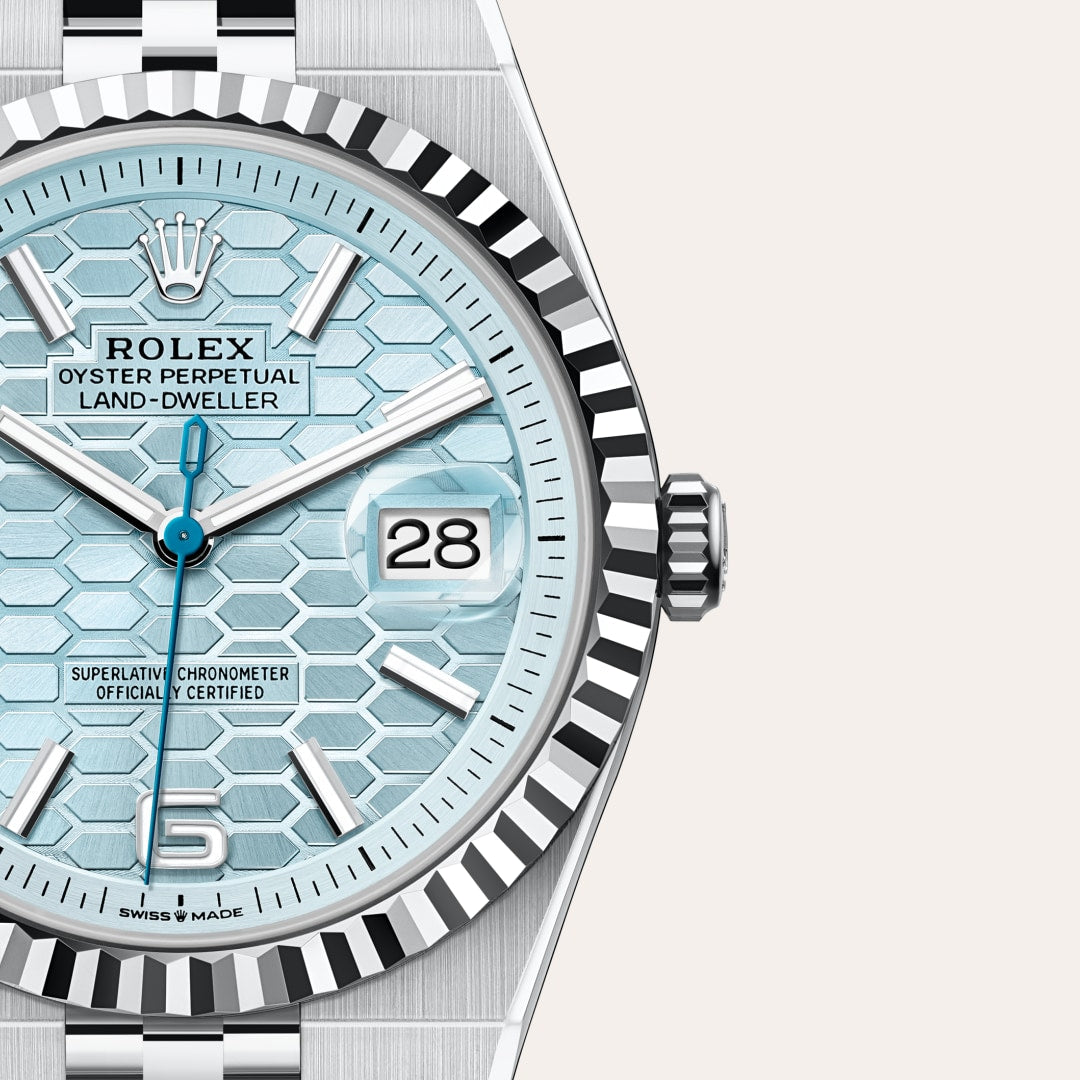 La lunette cannelée est l’élément signature de Rolex. Au départ, les cannelures de la lunette Oyster avaient un but fonctionnel : elles servaient à visser la lunette sur le boîtier, de manière à garantir l’étanchéité de la montre. De plus, elles étaient identiques aux cannelures présentes sur le fond de boîtier, lui aussi vissé sur le boîtier pour la même raison, au moyen d’outils Rolex spécifiques. Avec le temps, les cannelures sont devenues un élément purement esthétique, la signature de Rolex. Aujourd'hui la lunette cannelée est un élément signature, en platine sur cette Land-Dweller 40.