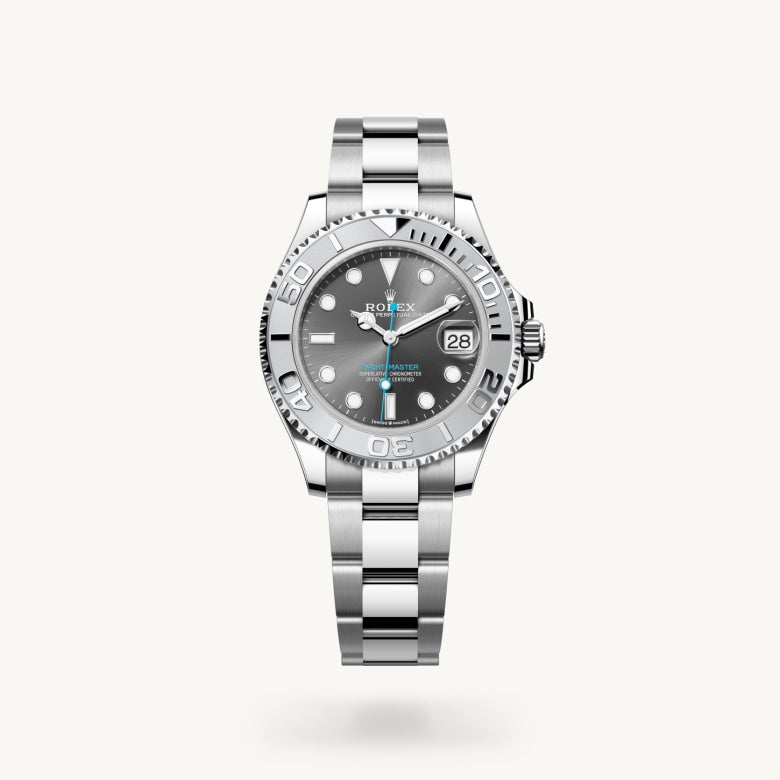 De nombreuses montres Rolex sont disponibles dans l’alliance désormais légendaire d’or jaune, gris ou Everose et d’acier connue sous le nom de Rolesor. Le Rolesium, quant à lui, est une création spécialement destinée à la Yacht‑Master. Tandis que le boîtier et le bracelet sont fabriqués en acier Oystersteel robuste, la lunette des modèles en version Rolesium est en platine. La blancheur argentée et la vive luminosité de ce matériau leur confèrent une élégance raffinée inimitable.