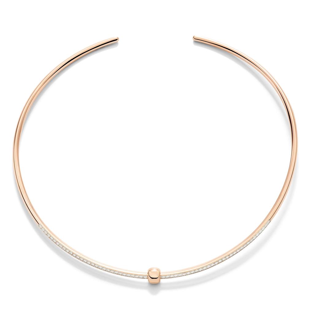 The Pomellato Together necklace in 18K rose gold celebrates the bonds that unite us. This sculptural choker, set with 60 white diamonds on rose gold plated with white rhodium, features a flexible cane design that hugs the neck while casting a refined glow. A symbol of love and connection, it combines comfort and timeless elegance.