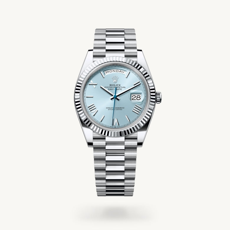 The ice-blue dial is the discreet and exclusive signature of a Rolex platinum watch. Rolex uses platinum, the noblest of metals, for the finest of watches. This exclusive dial colour can be found only on the Day-Date, the Cosmograph Daytona and the Perpetual 1908.