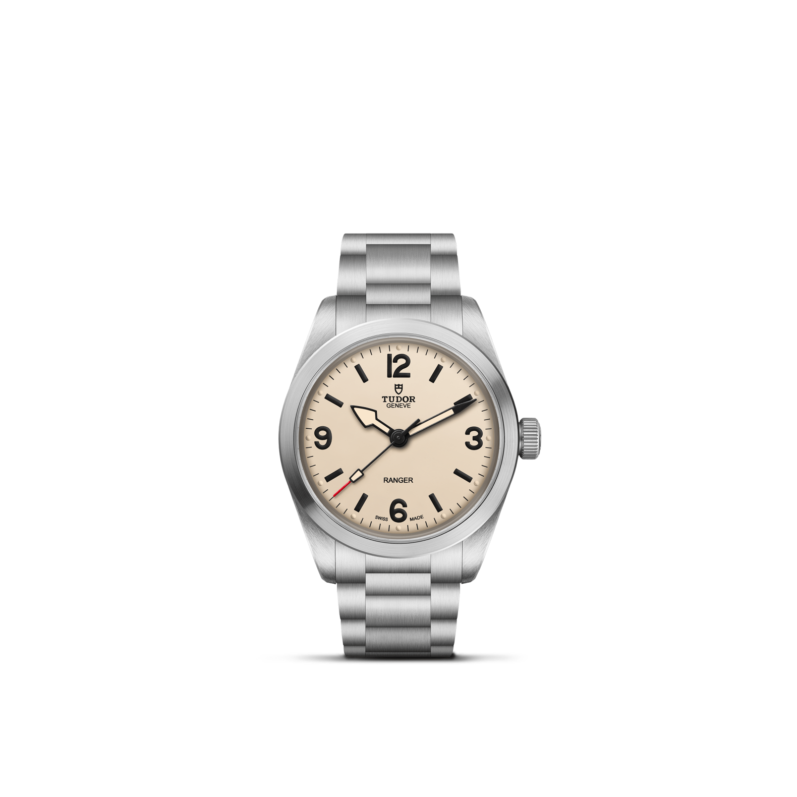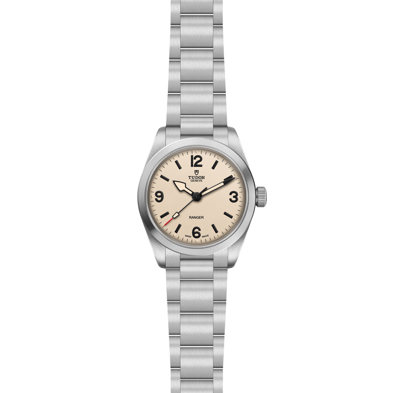 The 36 mm satin steel case, combined with the Manufacture MT5400 caliber certified by COSC, makes this Ranger a watch ready for adventure. Its beige domed dial pays tribute to TUDOR's commitment to the world's most demanding races. The "Ranger" hands and indices are coated with Super-LumiNova® for optimal readability in all conditions. Designed to face extreme environments, it features a smooth bezel, a screw-down crown adorned with the TUDOR rose, and a domed sapphire crystal. The three-link steel bracelet with folding clasp and T-Fit safety completes its robust and functional look.