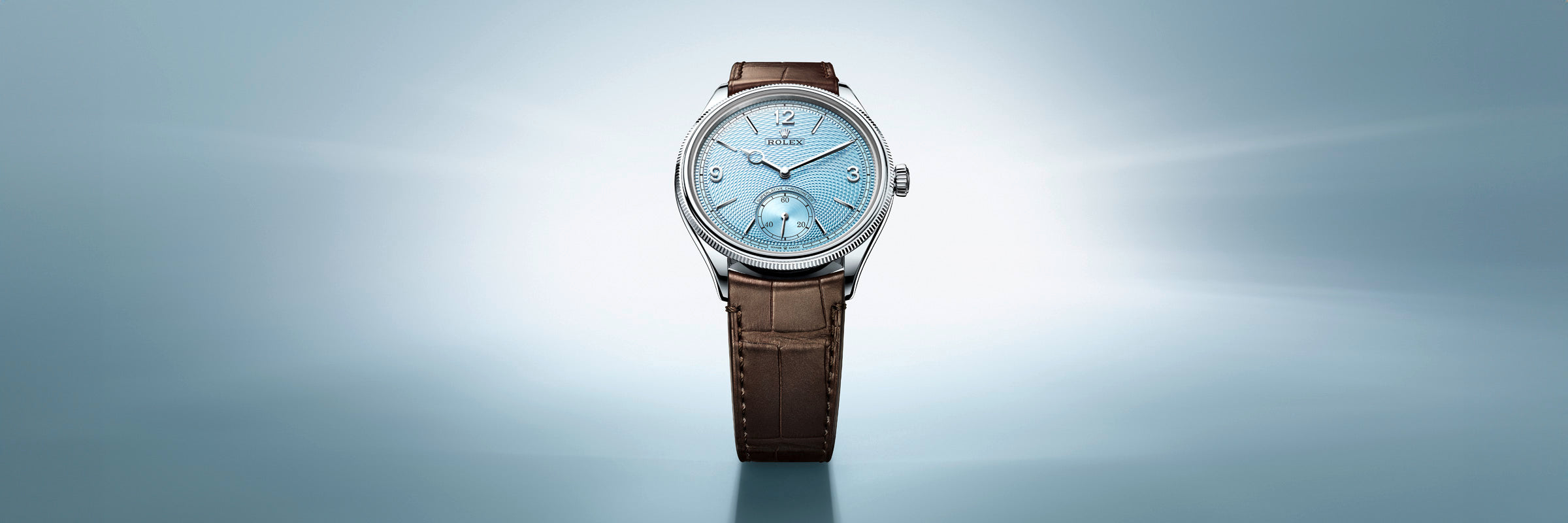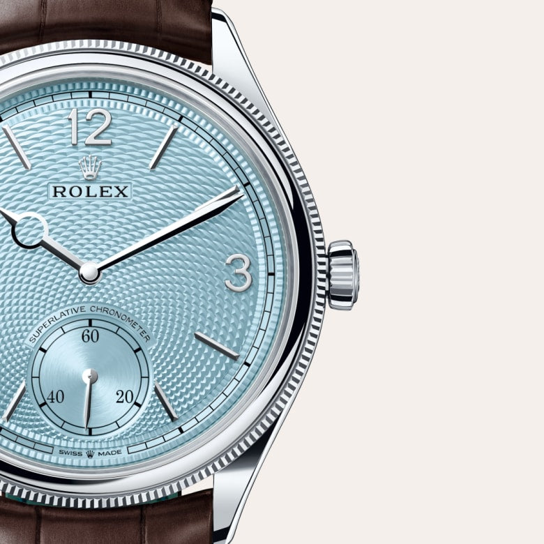 The ice blue dial features a guilloche rice-grain motif. This rosette-like design is distinctive for its three-dimensional, repeating geometric pattern that extends across the surface of the dial starting from the small seconds counter at 6 o’clock. The minute track around the dial is flanked by a finely crimped guilloche-work border. With the introduction of a dial created via guillochage, or engine turning – a technique that uses a graver to sculpt a pattern into a surface – Rolex is pursuing the course it has set for the Perpetual collection as a tribute to the classic art of watchmaking infused with the brand’s know-how and creativity. This exclusive dial bears the same Arabic numerals 3, 9 and 12, the same faceted hour markers and the same hands as that of the 18 ct gold versions. This exclusive dial colour can be found only on the Day-Date, the Cosmograph Daytona and the Perpetual 1908.