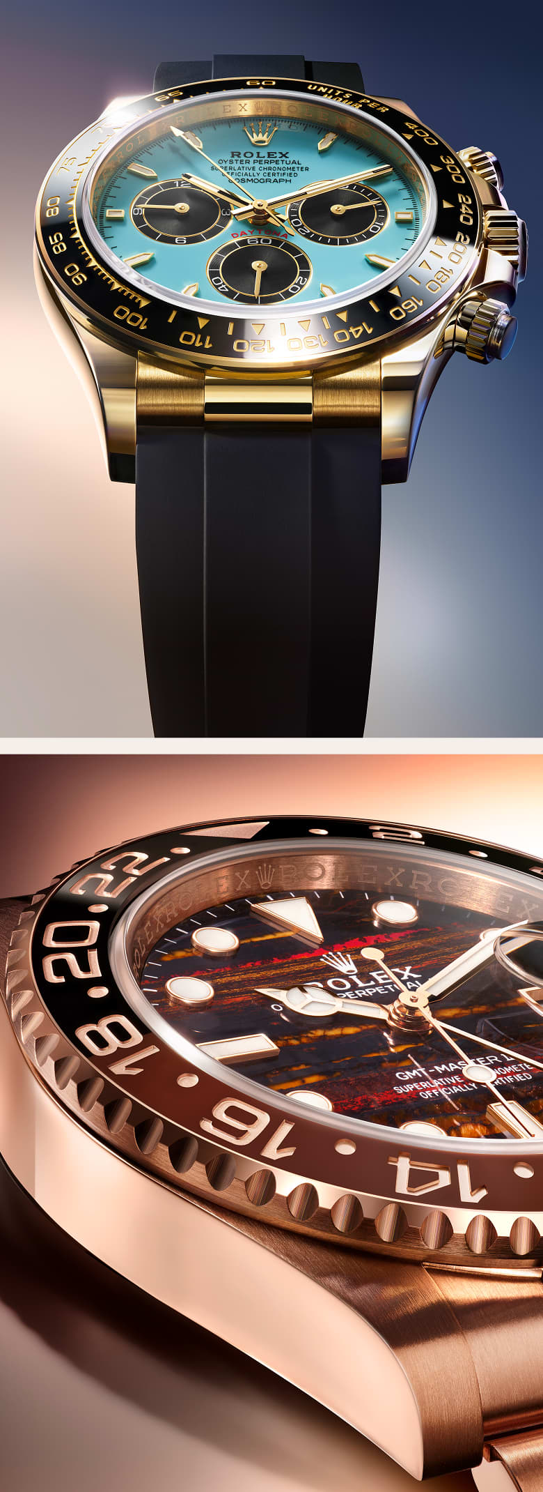 Le Cosmograph Daytona en or jaune 18 ct avec cadran laqué bleu turquoise est muni d’une lunette Cerachrom monobloc en céramique noire. Sur la GMT‑Master II en or Everose 18 ct avec cadran en œil de fer, la lunette tournante bidirectionnelle est dotée d’un disque Cerachrom gradué 24 heures bicolore en céramique brune et noire.