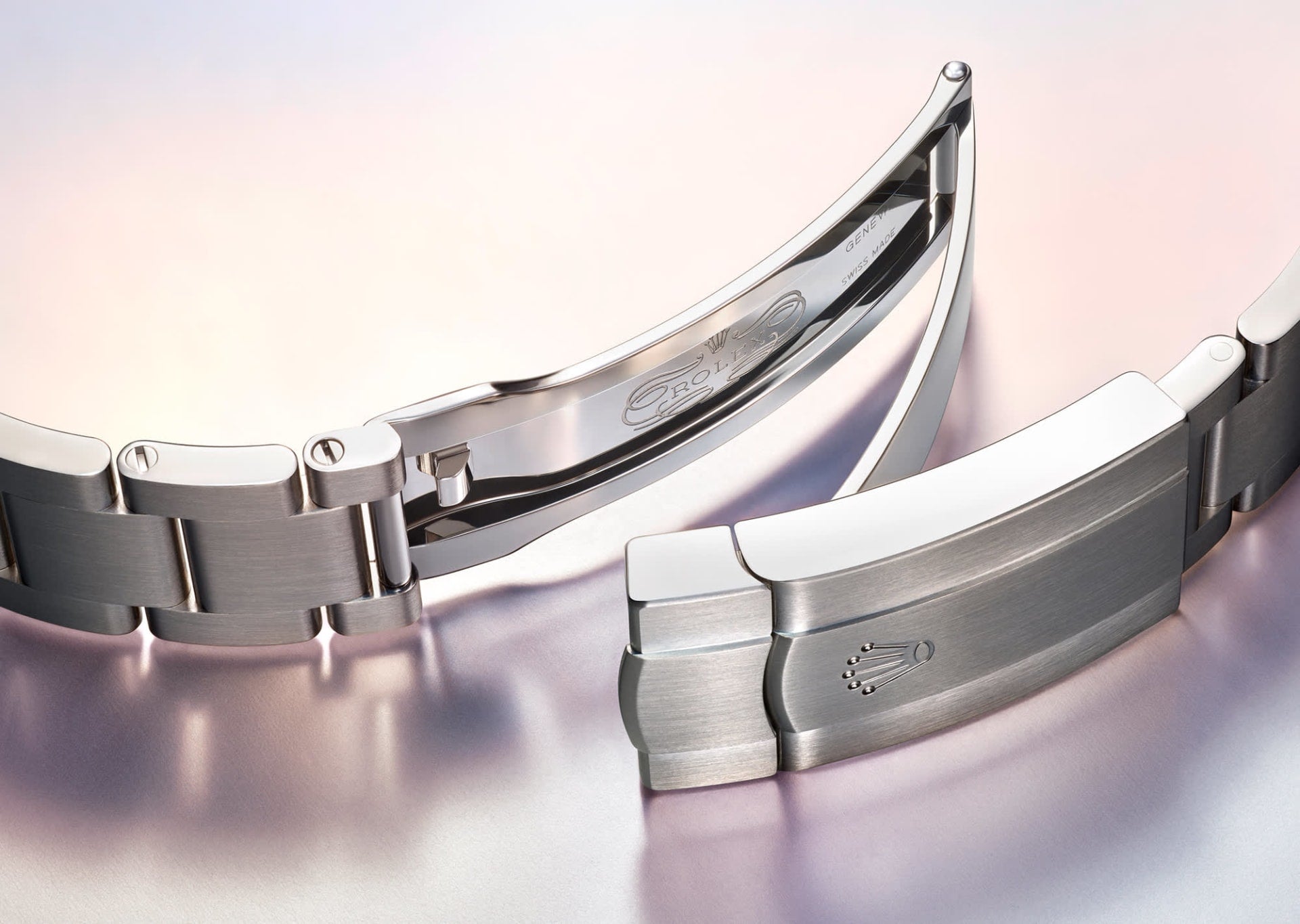 Sur ces montres, il est réalisé en acier Oystersteel et pourvu d’un fermoir Oysterclasp à boucle déployante. Il dispose de la rallonge rapide de confort Easylink, développée par Rolex, qui permet d’ajuster facilement sa longueur d’environ 5 mm.