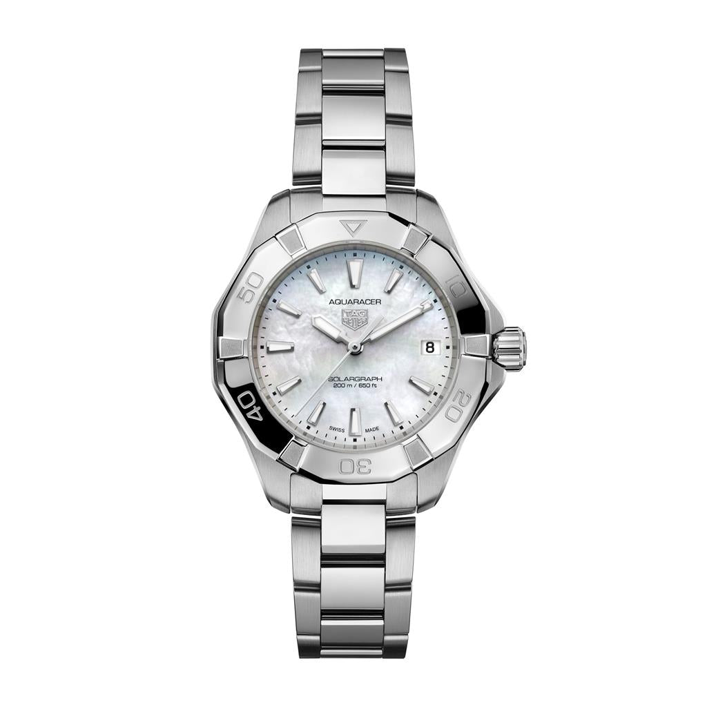 Montre TAG Heuer Aquaracer Professional 200 Solargraph, boîtier acier 34 mm, cadran nacre blanche, lunette acier 60 minutes, bracelet acier, mouvement solaire TH50-01.