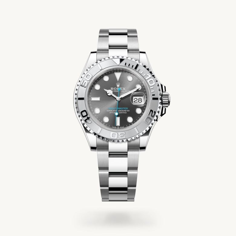 De nombreuses montres Rolex sont disponibles dans l’alliance désormais légendaire d’or jaune, gris ou Everose et d’acier connue sous le nom de Rolesor. Le Rolesium, quant à lui, est une création spécialement destinée à la Yacht‑Master. Tandis que le boîtier et le bracelet sont fabriqués en acier Oystersteel robuste, la lunette des modèles en version Rolesium est en platine. La blancheur argentée et la vive luminosité de ce matériau leur confèrent une élégance raffinée inimitable.